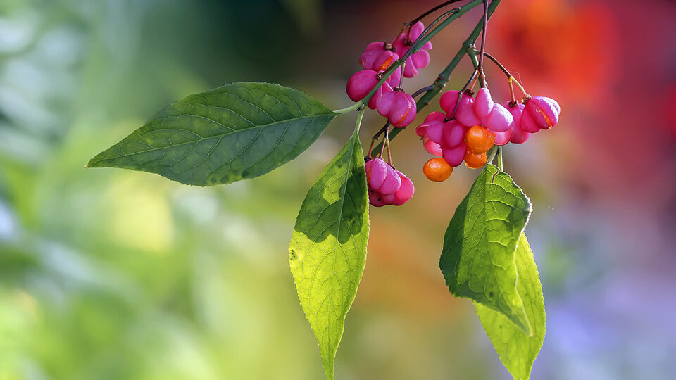 - Бересклет европейский (Euonymus europaeus) — прекрасный кустарник с рыхлой кроной и впечатляющими розовыми плодовыми коробочками.