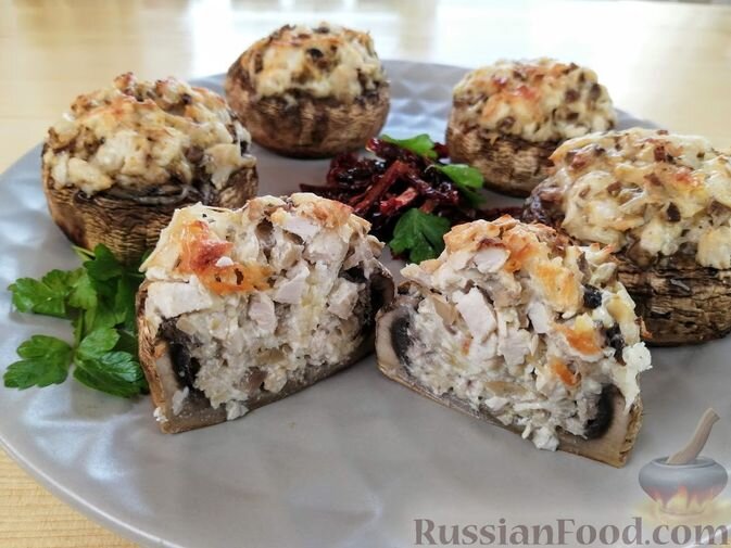 Фаршированные шампиньоны с сыром и жареной куриной грудкой – еще одна находка для любителей грибных блюд. В качестве начинки можно использовать также ветчину или колбасу по желанию.