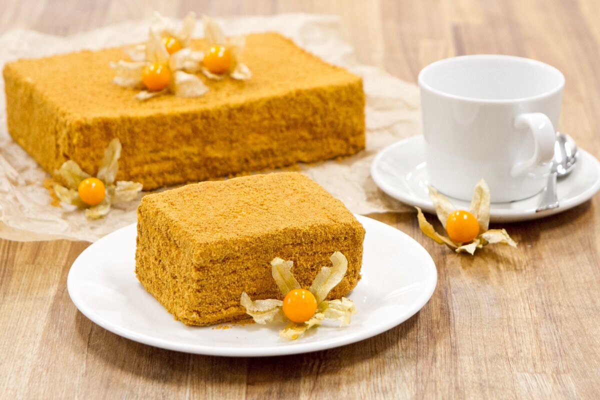 В небольшом сотейнике растопите сливочное масло, мед и сахар, доведите до кипения, затем добавьте разрыхлитель и соду. Остудите смесь до комнатной температуры.После этого добавьте яйцо в остывшую массу. В отдельной миске смешайте муку с ванильным сахаром, затем соедините с яично-масляной смесью и дайте тесту немного остыть.Разделите тесто на 6 равных частей, раскатайте каждый кусок в корж толщиной 1 мм и диаметром 26 см. Обрезанные края теста отложите. Выпекайте коржи при температуре 180 градусов в течение 5-10 минут, затем дайте им остыть. Обрезки измельчите в крошку с помощью блендера.В отдельной миске взбейте сливки, сметану и сахарную пудру до устойчивых пиков.На первый корж нанесите крем ровным слоем, сверху положите второй корж, и продолжайте в том же духе до окончания теста. Обсыпьте торт крошками и поставьте пропитываться в холодильник на 12 часов.