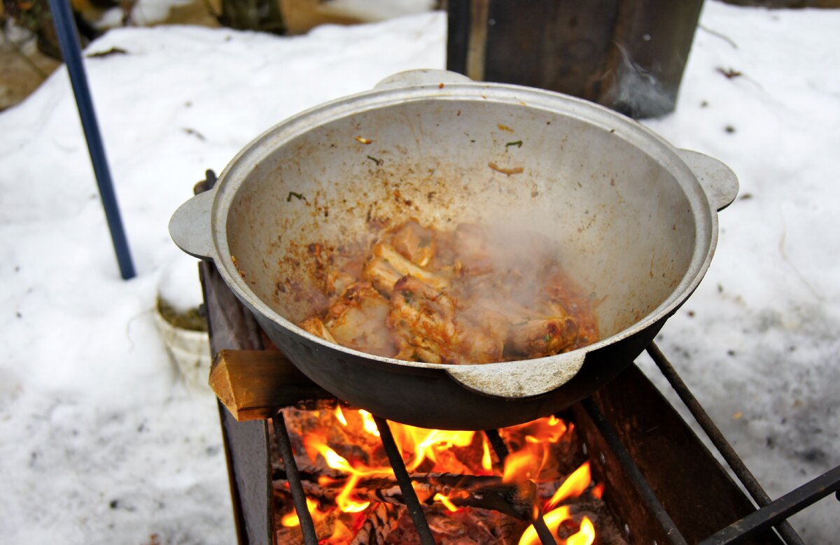 1 января 2015 года запомнится многим как время ярких воспоминаний и насыщенных вкусами праздников. На даче, где новогодняя ночь прошла весело и сытно, осталась уйма еды, но собравшаяся компания решила использовать остатки по-новому и устроить готовку на улице.