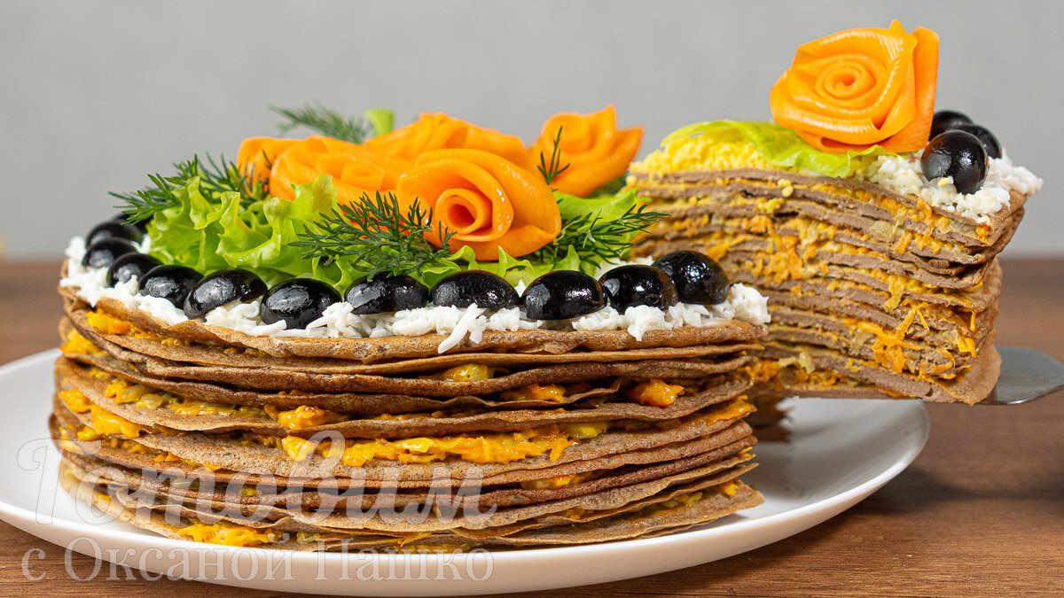 Этот закусочный торт непременно привлечет внимание ваших гостей своим необычным оформлением и вкусом. Смотрите видеорецепт, чтобы не упустить ни одной детальки!