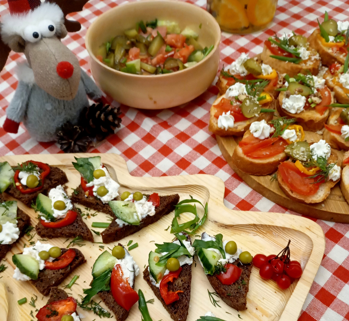 - Канапе с фиш-кремом: Используя бородинский хлеб, нарезать его на треугольники, подсушить с оливковым маслом и щедро намазать кремом на основе кальмаров и креветок. Украсить свежими огурцами и зелеными овощами для яркости.