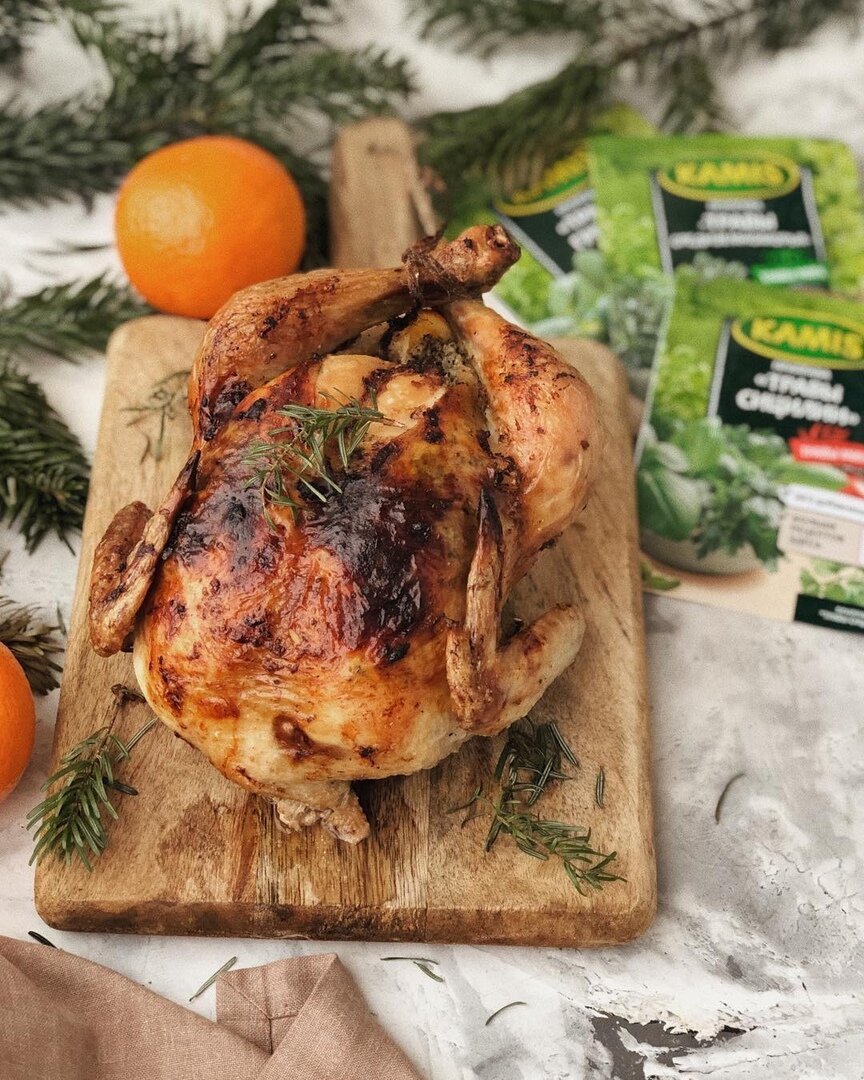 Внутрь курицы положите дольки лимона и мандарина, а затем аккуратно перевяжите ножки и отверстие с помощью кулинарной нити. Теперь цыпленка можно выкладывать в форму для запекания. Поставьте его в разогретую до 200°C духовку и готовьте от одного до двух часов. Время зависит от размера птицы, не забывайте периодически поливать ее соусом для большей сочности.