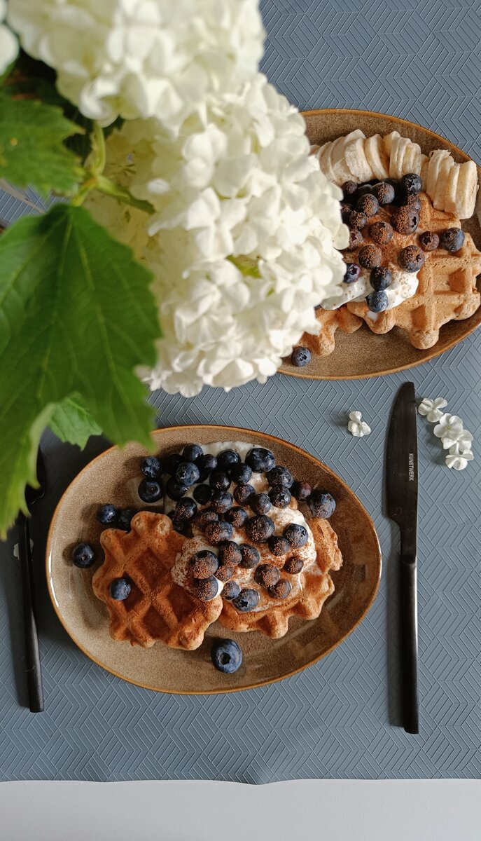 Эти чудесные вафли можно подавать со сметаной, творогом или ягодами, а сверху посыпать тонким слоем какао. Наслаждайтесь!