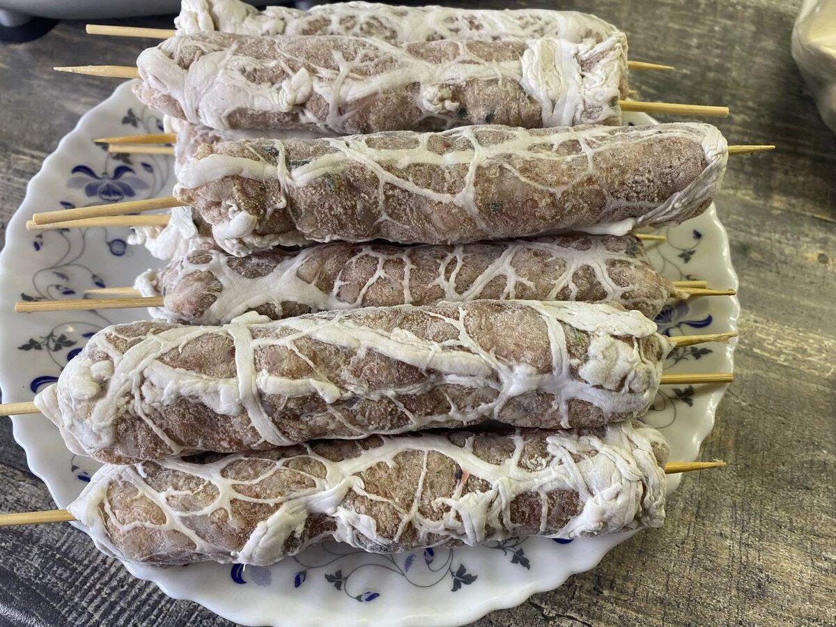5. Каждую колбаску оборачиваем жировой сеткой и насаживаем на шпажку.