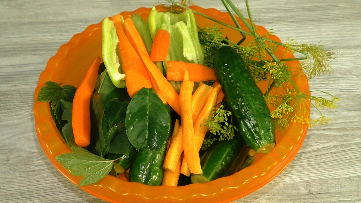 На дно банок следует положить зелень и специи. Важно, чтобы хрустящие огурцы были дополнены сладким болгарским перцем и нарезанной морковкой, которые не только добавляют красок, но и сами имеют приятный вкус.
