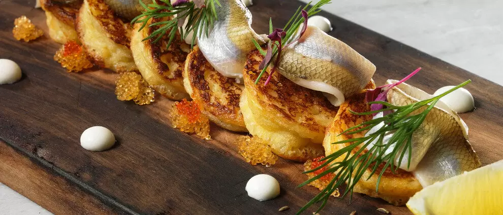 Маринование рыбы: Смешать филе корюшки с чесноком, уксусом, укропом, лавровым листом, чили, морковью и шалотом, влить бульон. Готовить на медленном огне 10 минут, процедить и охладить.Приготовление картофеля: Вакuumно сварить картофель на протяжении 20 минут, затем размять его с молоком и маслом до однородной массы.Замешивание теста: Просеять муку в картофельное пюре, добавить сливки и желтки, затем взбить белки, вводя их в тесто.Жарка блинчиков: На сковороде растопить масло и жарить блинчики по столовой ложке теста.Приготовление соуса: Смешать сметану с лимонным соком, укропным маслом, солью и сахаром.Сервировка: На блинчики выложить корюшку и украсить соусом с укропом.Тартар из лосося с огурцами и икрой