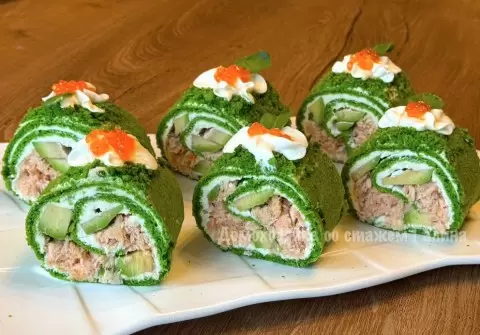 Перед подачей рулет смажьте сыром, обсыпьте крошкой из обрезков коржа и украсьте по собственному усмотрению, добавив, например, икру для праздничного оформления. Далее нарезать на порции и подавать к столу! Этот рулет станет настоящим вкусным акцентом на любом праздничном столе.
