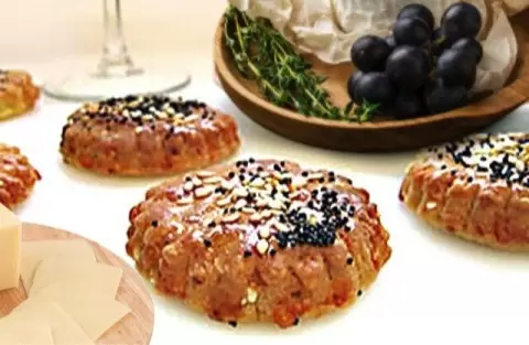По истечении времени разогрейте духовку до 160°C. На рабочей поверхности с небольшим количеством муки раскатайте тесто в пласт толщиной около 5 мм и вырежьте круги. Противень выстелите пергаментом и уложите заготовки. Смажьте их желтком с водой и посыпьте кунжутом и маком. Выпекайте 15 минут, проверяя готовность.