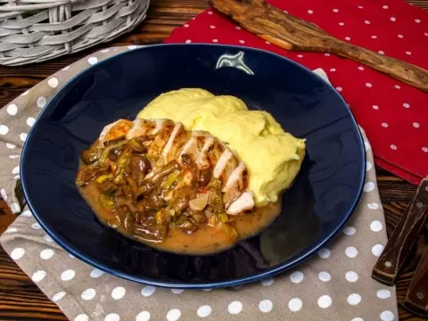 Сервируйте горячее куриное филе с картофельным пюре, обильно полив его ароматным сливочным соусом. Это блюдо станет настоящим украшением вашего стола!
