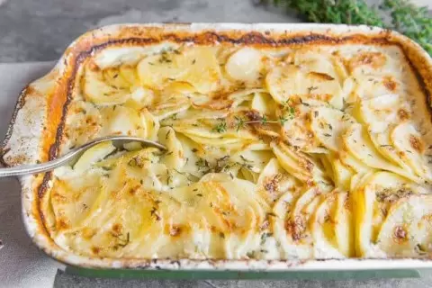 - Картофель «Дофин»: Французская кулинарная классика, в которой тонкие ломтики картофеля, заполненные сливками и мускатным орехом, запекаются под сырной корочкой.