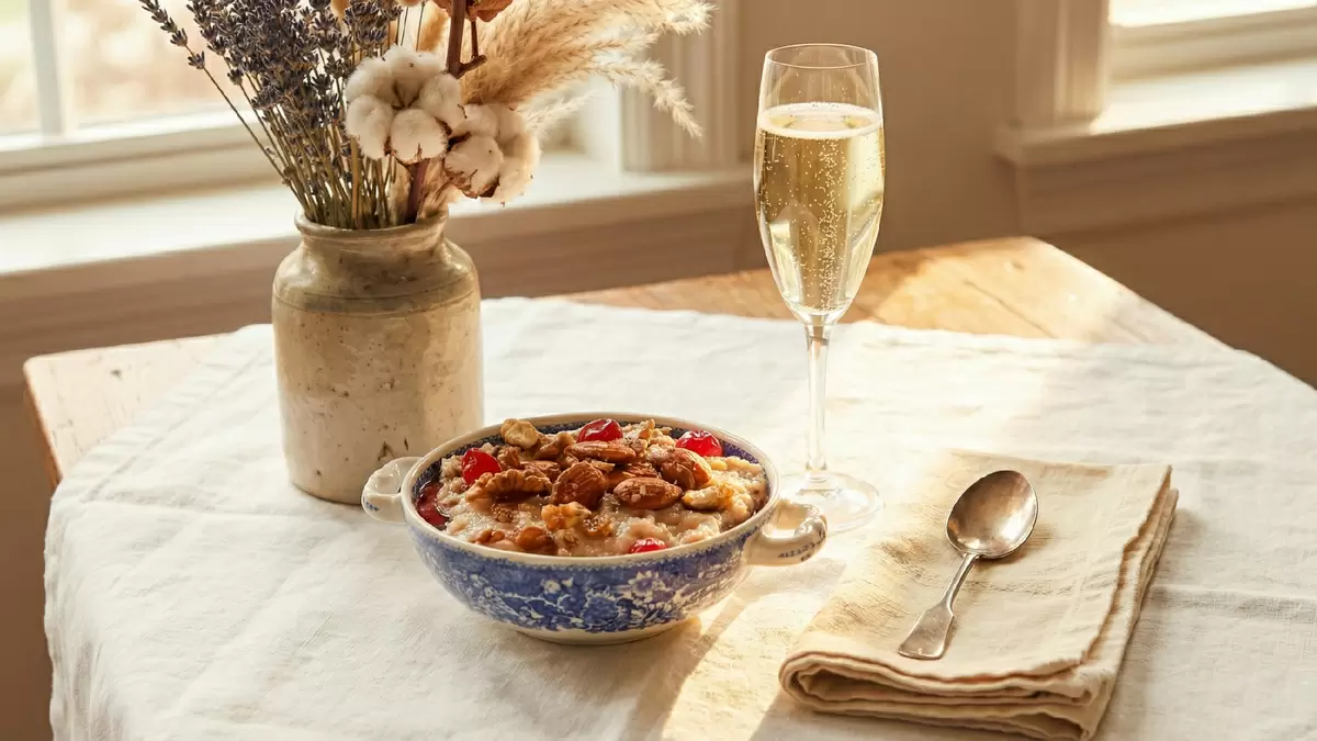 Гурьевская каша идеально сочетается с полусладким игристым вином, которое подчеркнет вкусы сладости и орехов, создавая гармоничное гастрономическое впечатление.