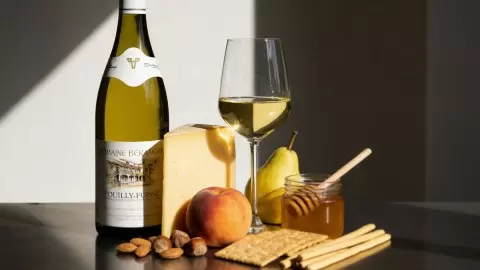 Живая кислотность и ореховые ноты Pouilly-Fuiss? Domaine B?ranger идеально дополняют плотную текстуру и умамный вкус Комте. Это сочетание подчеркивает сладость сыра и выявляет глубину минеральных грани шардоне.