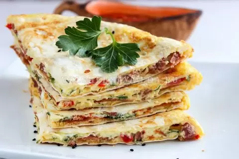 Далее, на сковороду с небольшим количеством растительного масла укладывается первый слой лаваша. На него равномерно распределяется половина тертого сыра. В уютной миске разбиваются яйца, добавляется соль и перец, и всё это взбивается вилкой. Получившуюся яичную массу выливают на лаваш.
