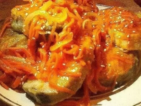 Рыбу следует нарезать на стейки. Лук мелко нарезать, а морковь натереть на корейской терке. В сковороду добавить растительное масло и на медленном огне, под крышкой, тушить овощи около 10 минут.