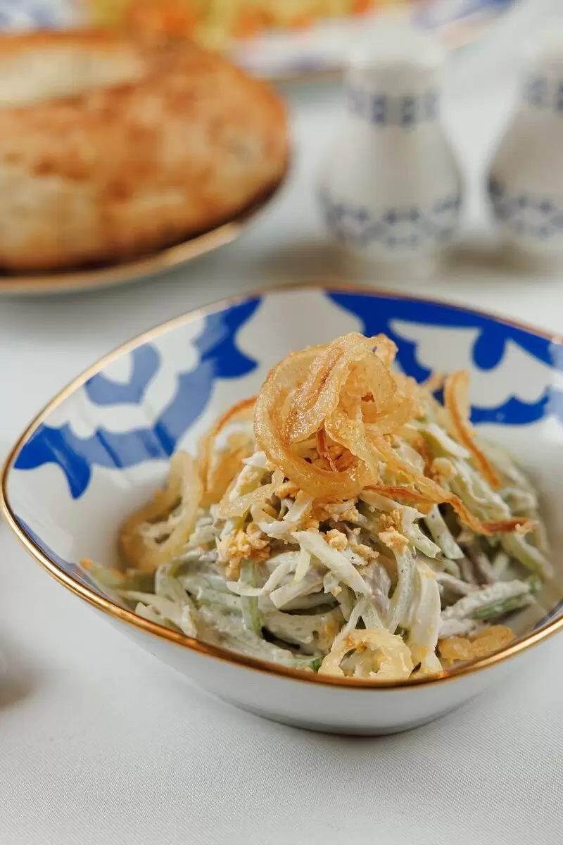 - Салат «Ташкент»: В этом салате угадываются ноты советской эпохи. Сочная редька, нежная телятина и хрустящий лук-фри создают идеальное трио, которое радует привычным вкусом.