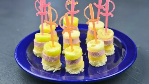 Все ингредиенты нужно нарезать на небольшие кусочки, чтобы они легко помещались в рот и были удобны для набора на шпажку.
