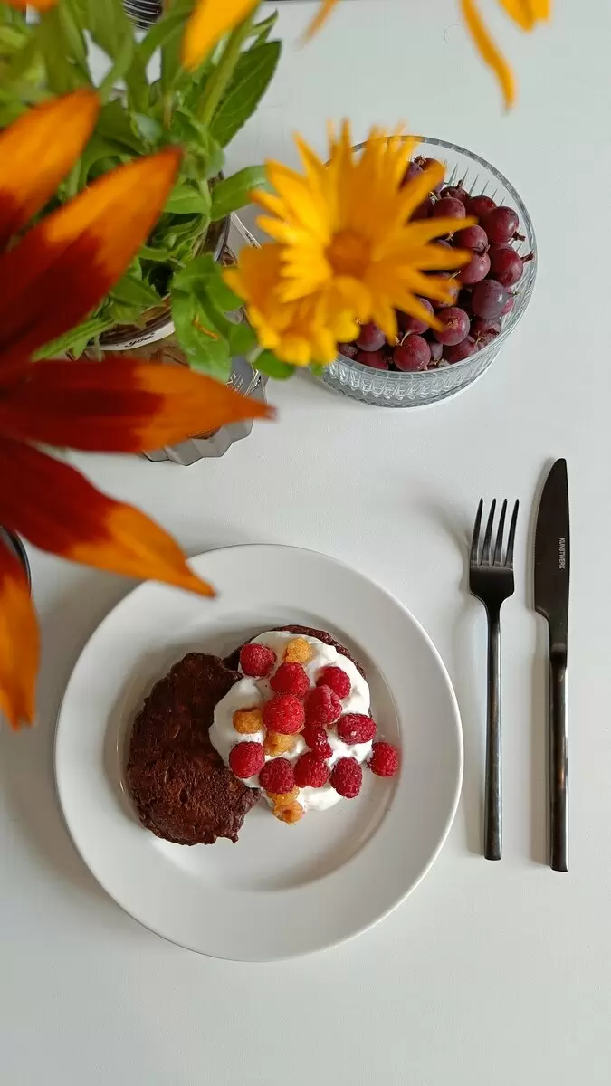 Рецепт шоколадно-яблочных оладий вдохновлён идеями из книги о здоровом питании. В процессе приготовления был использован мультипекарь, который, к сожалению, не проявил себя должным образом, и вафли получились неудачными. Но на этом неудачи не закончились! Остатки теста, которые невозможно было выбросить, были превращены в оладьи, обжаренные на масле. В результате получился неожиданный, но удивительно удачный десерт с характерной текстурой, напоминающей брауни. И финальный результат всех приятно порадовал.
