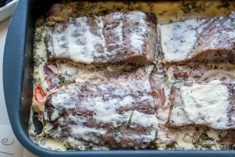 Покройте рыбу получившейся заливкой, накройте форму фольгой и отправьте в духовку на 45 минут.