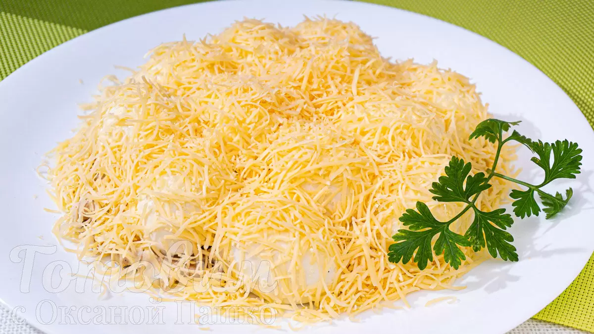 7. Сверху аккуратно располагаем фаршированные яйца и обсыпаем тертым сыром. Всю поверхность обмазываем майонезом для красоты и аппетитности.