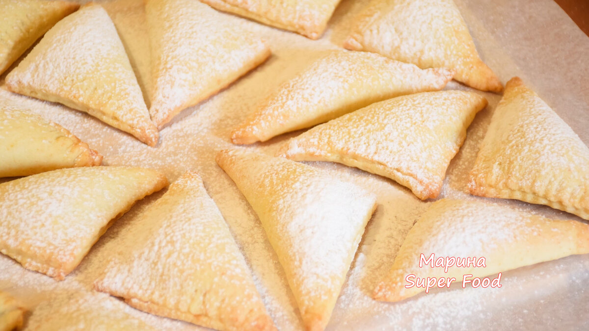 Треугольники помещаются на противень, застеленный бумагой для выпечки, и отправляются в предварительно разогретую до 180°C духовку. Выпекать их нужно около 25 минут. По завершении, пирожки слегка остужают и посыпают сахарной пудрой. Идеальная сладкая закуска готова к подаче!