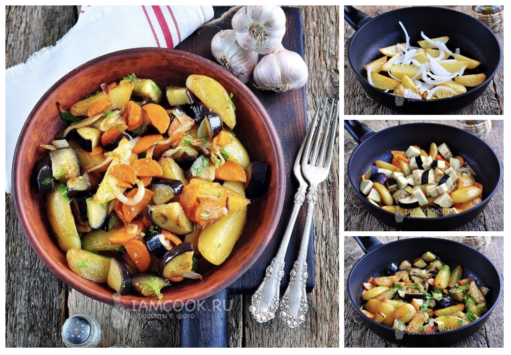 3. Нарезать баклажан кубиками, добавить его в сковороду, тщательно перемешать и готовить под крышкой в течение 10 минут.