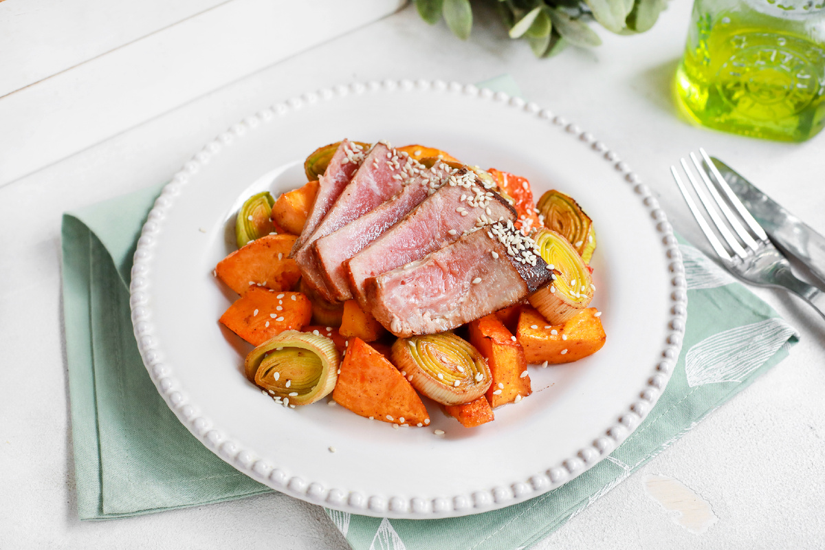 Когда овощи будут готовы, в оставшуюся часть соуса помещается тунец, который следует обмакнуть с обеих сторон и подержать в соусе 2-3 минуты. Далее на нагретую сковороду с растительным маслом помещается стейк, который обжаривается по 30 секунд с каждой стороны на сильном огне. После обжаривания тунца его накрывают крышкой и оставляют настояться на 5-6 минут. Затем рыбу нарезают тонкими слайсами и подают с запеченными овощами, приправив кунжутом.