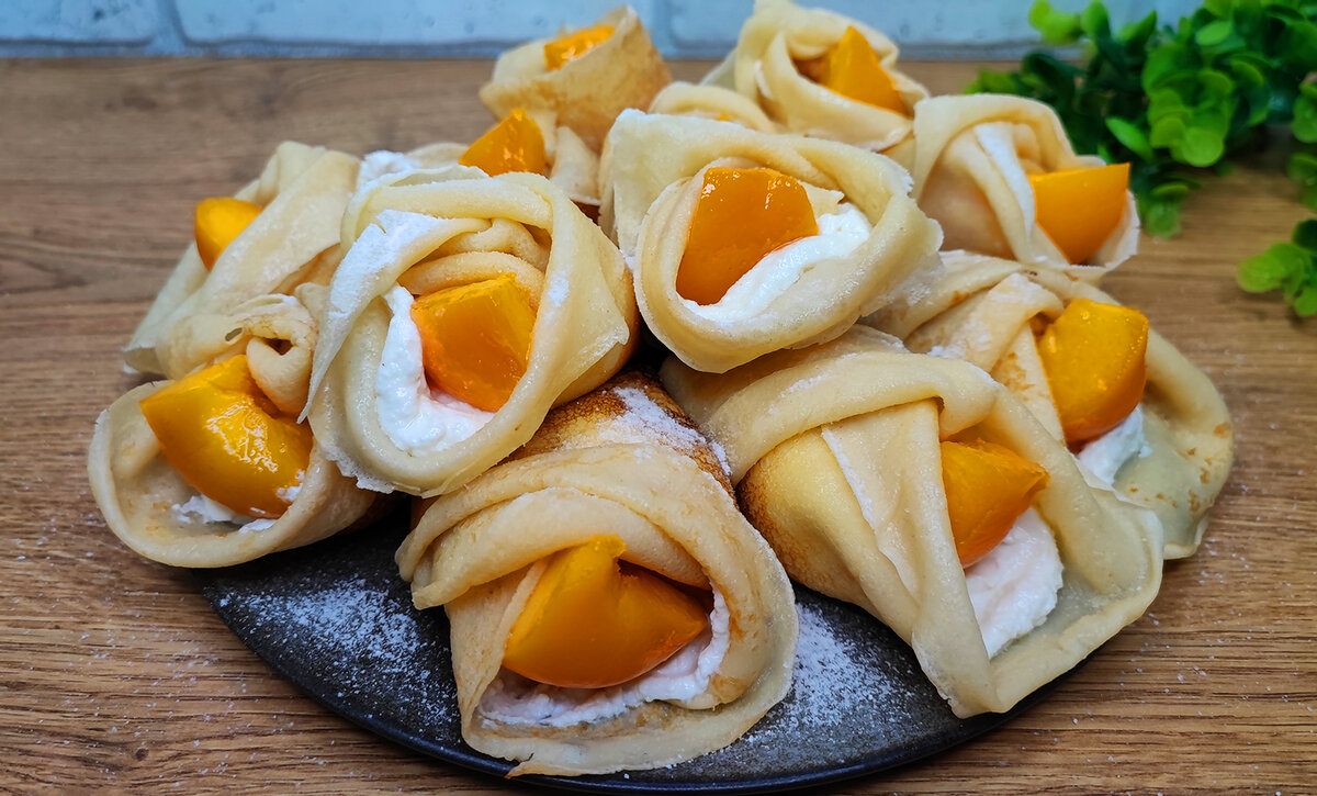 Для нежной начинки стоит воспользоваться погружным блендером: перебейте творог до гладкости и добавьте сахарную пудру по вкусу. На каждый блин распределите творожную массу и добавьте небольшой кусочек персика. Заверните блины в любой форме, которая вам по душе.