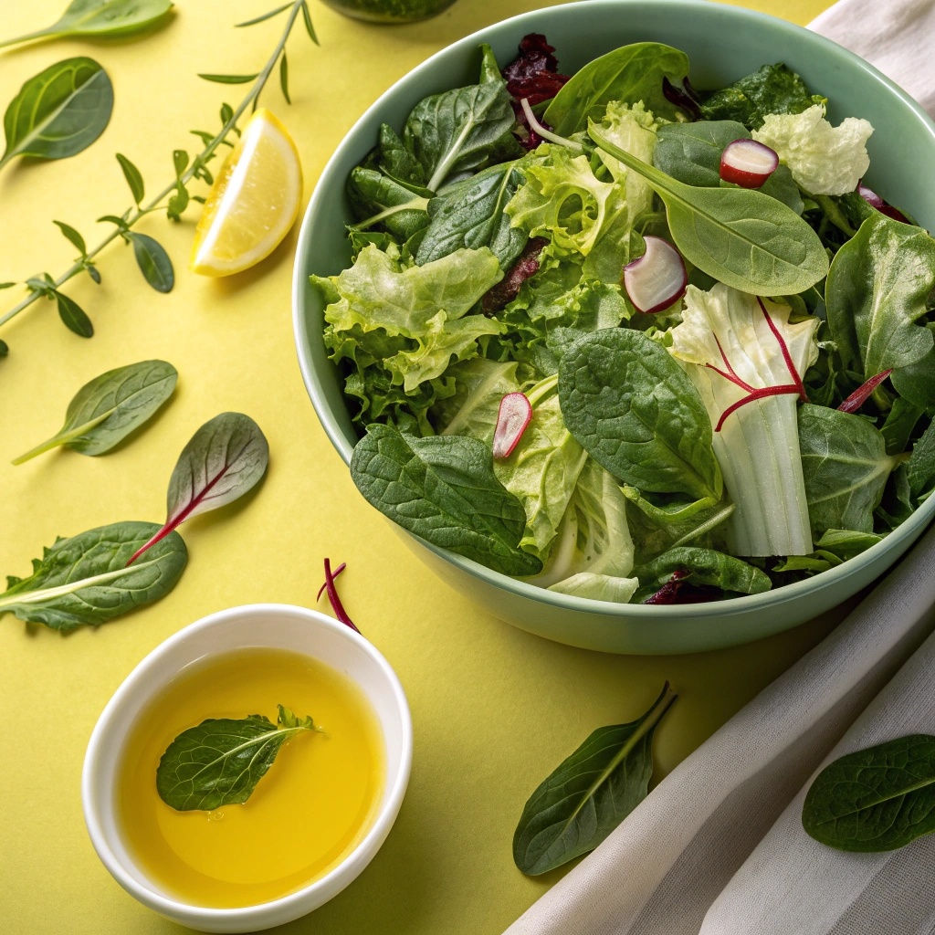 - Микс салатных листьев с рукколой, шпинатом и мангольдом: свежие листья, сбрызнутые лимонным соком и оливковым маслом, создают идеальную основу для легкого и питательного блюда.