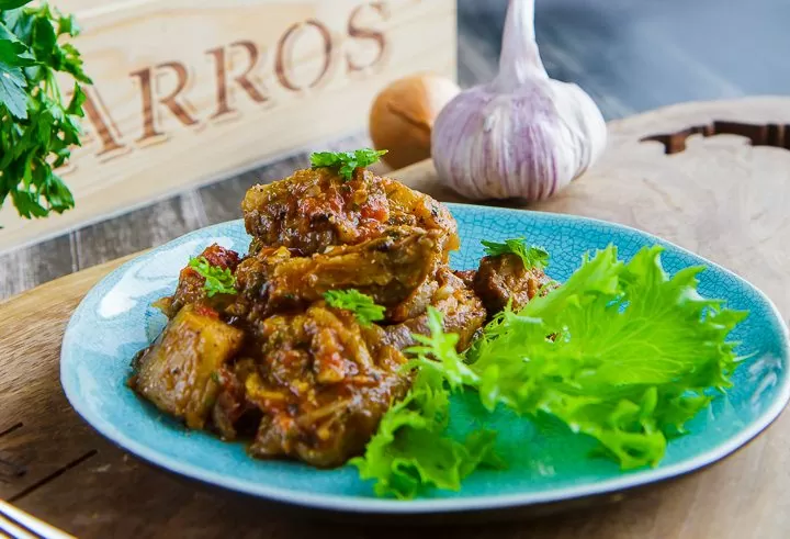 На оставшемся от мяса жире обжариваются баклажаны, после чего временно откладываются. На этом же жире готовится лук с целыми зубчиками чеснока, пока не станет мягким. К ним добавляются нарезанные помидоры и баранина — все ингредиенты тщательно перемешиваются. В самом конце в блюдо вводятся бадьян, корица и острый перчик, после чего все тушится под крышкой на медленном огне в течение 2 часов, периодически добавляя немного воды.