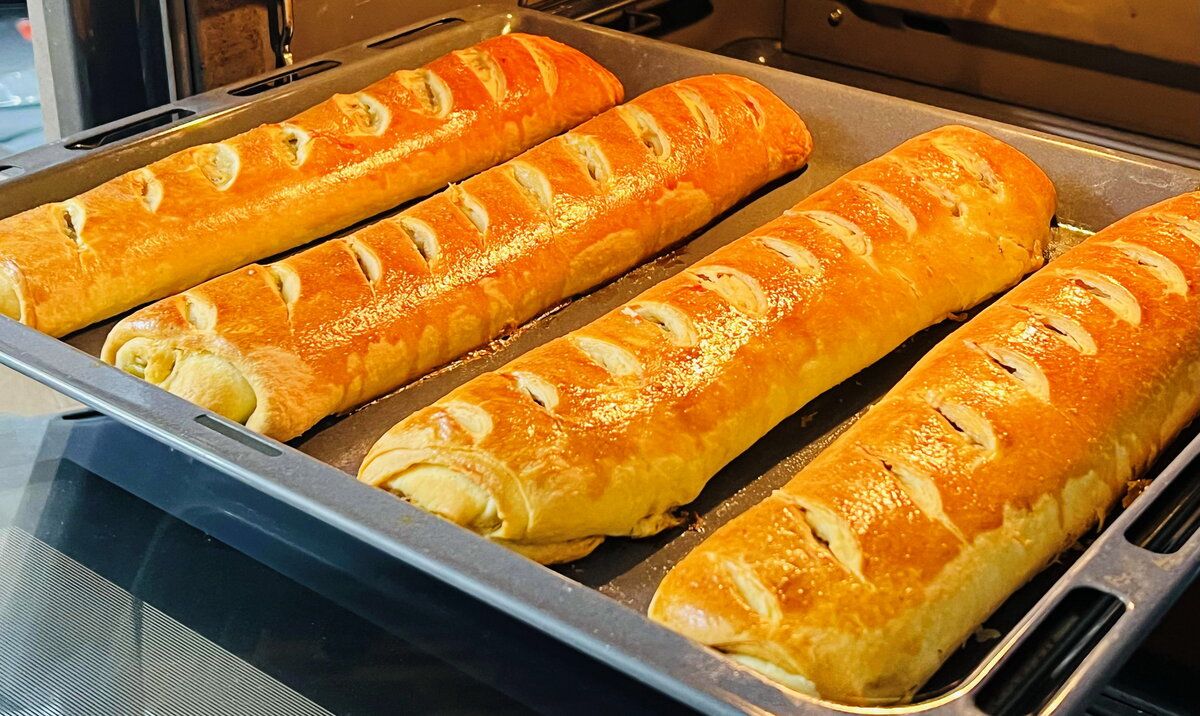 Когда тесто подошло, его стоит разделить на четыре равные части, скатать в колобки и раскатать в тонкие пласты. Каждый слой смазывается размягчённым сливочным маслом, после чего складывается. Затем раскатанный пласт лучшим образом наполняется начинкой, аккуратно заворачивается в рулет и украшается надрезами.