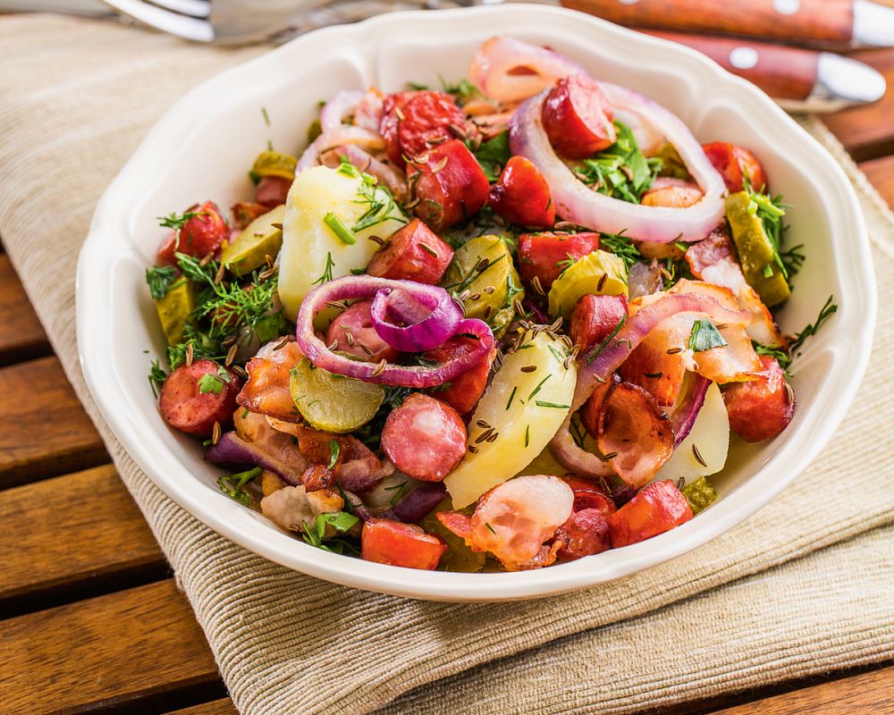 Ищете сытный и аппетитный салат, который не только удивит вас своим вкусом, но и станет ярким акцентом на любом столе? Обратите внимание на баварский салат с охотничьими колбасками и картофелем. Это блюдо соединяет в себе богатство немецкой кулинарной традиции и простоту домашнего приготовления. Ароматные копченые колбаски, нежный картофель и свежие овощи составляют идеальный ансамбль, подходящий как для семейного ужина, так и для дружеской встречи.