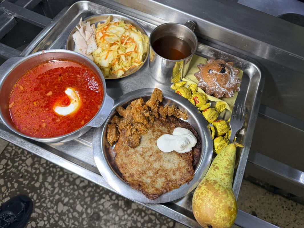 Обед, в который уже закладывается стоимость, включает массивный металлический поднос с фиксированным набором: арахис, шесть конфет, борщ, салат, сало, драники с поджаркой, хлеб, кекс и груша. Общая калорийность обеда составляет 1400 ккал на человека.