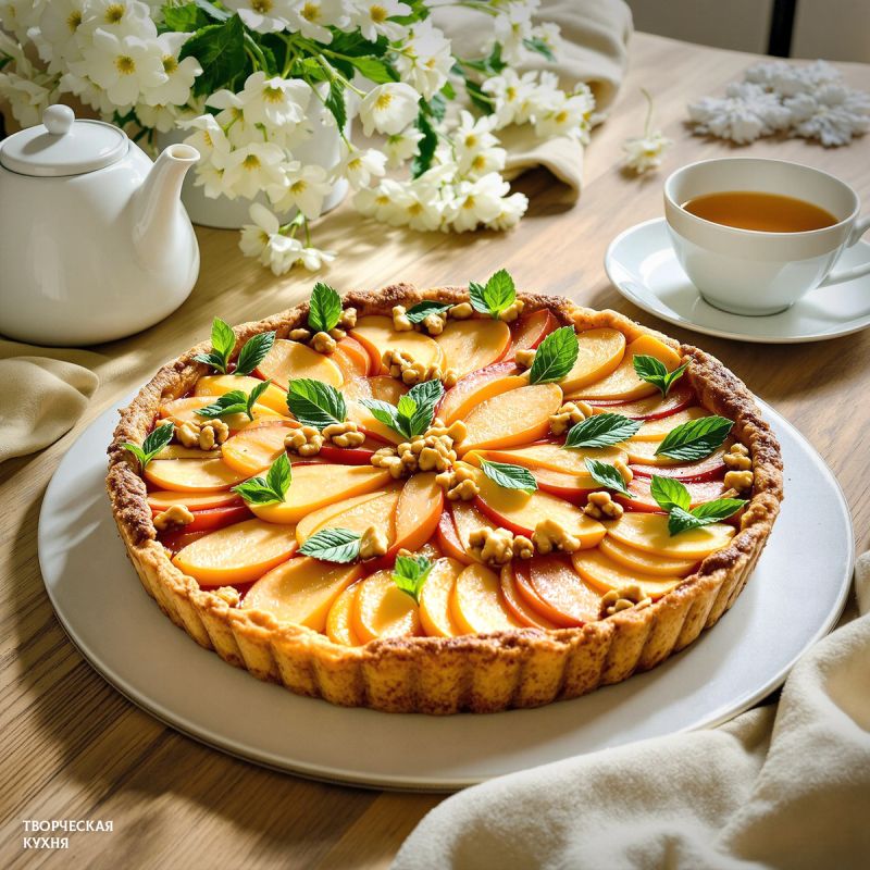 Когда пирог будет готов, смазать его грушевым сиропом, накрыть полотенцем и оставить на 35-40 минут. Подавайте с чаем, украшенным мятой — и насладитесь вкусом домашней выпечки!