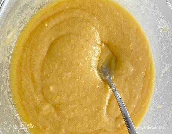 В качестве финального штриха можно посыпать пирог штрейзелем. Для подготовки используйте форму диаметром 26 см. Смешайте все ингредиенты (кроме штрейзеля и фруктов) до получения однородной массы — не обязательно взбивать.