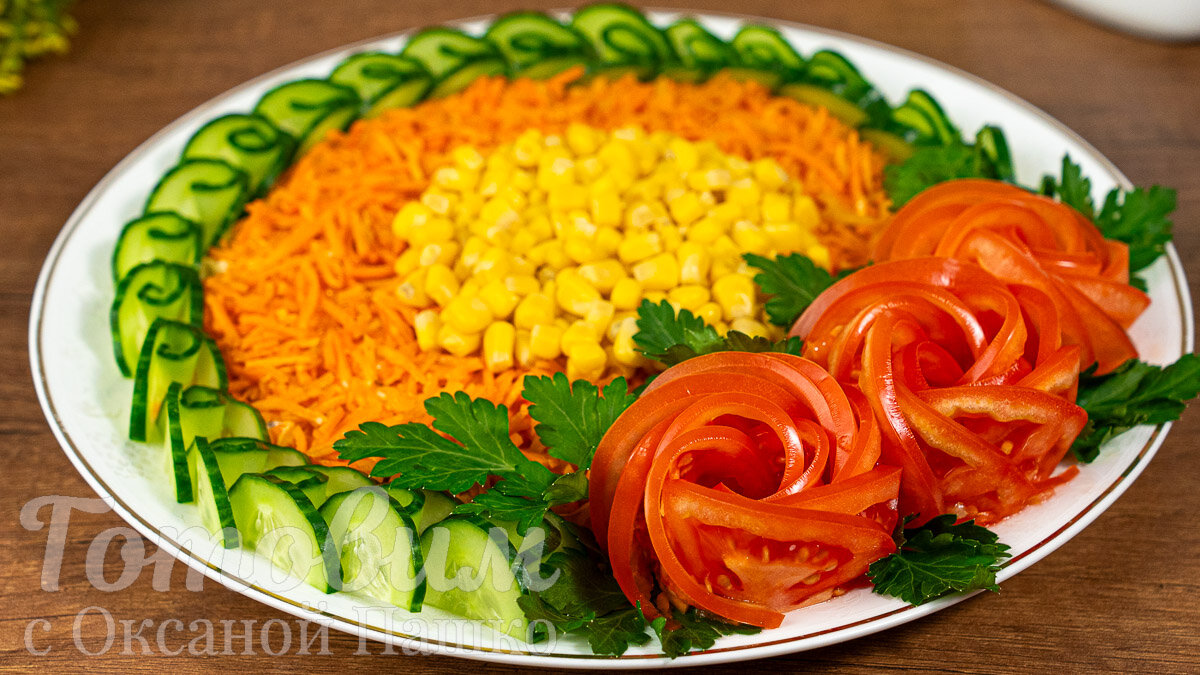 Этот удивительный салат с куриным филе и овощными украшениями станет настоящей находкой для любого праздничного стола. Легкий в приготовлении и невероятно вкусный, он обязательно впечатлит ваших гостей. Нежное куриное мясо гармонично соединяется с яркой и пряной морковью по-корейски, а оригинальные украшения в виде роз из помидоров придают блюду особый шарм.