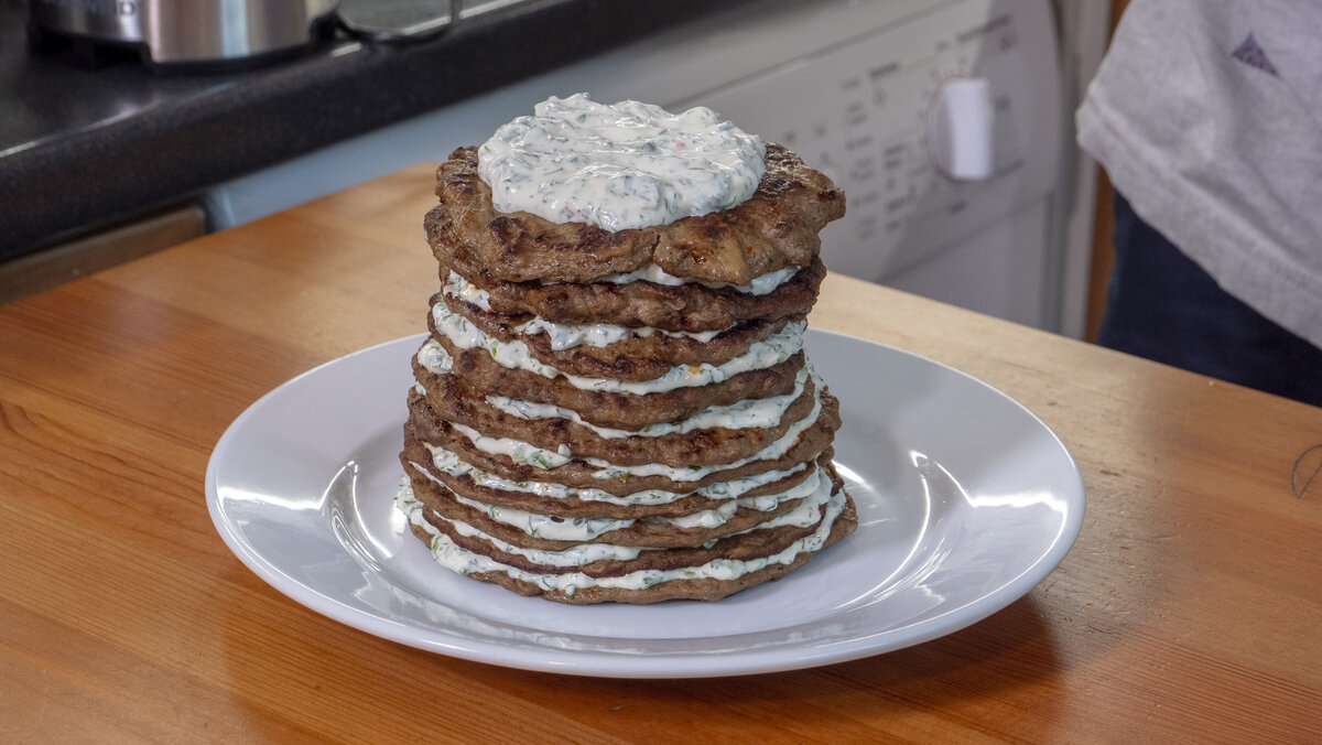 Для соуса смешиваются майонез, сметана и мелко нарезанные травы. В смесь добавляют чили и натертый чеснок для пикантности. Теперь пора собрать торт: каждый оладий смазывают соусом и укладывают слоями на тарелку. Завершением станет декорирование острого перца, вставленного в центр торта.