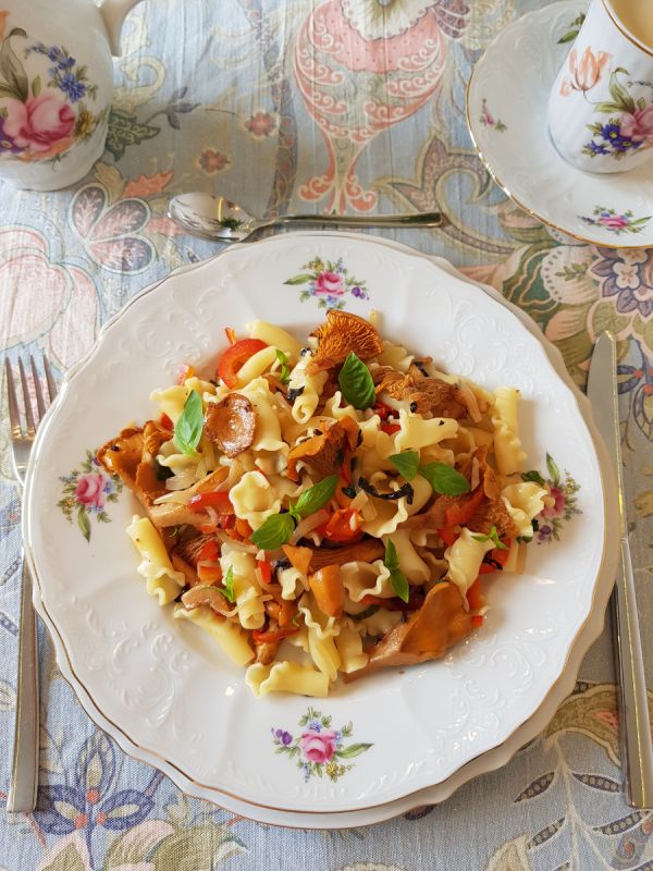 Смешайте макароны с лисичками и овощами, выложите на тарелки.