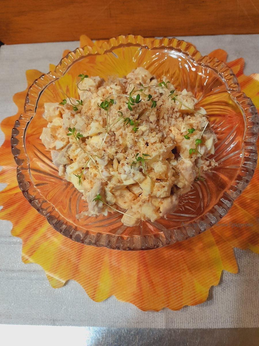 Все эти ингредиенты аккуратно соединить в глубокой миске, добавить соль и перец по вкусу, заправить майонезом и тщательно перемешать. Для завершения можно посыпать мелко нарубленными грецкими орехами. Их можно как оставить сверху для украшения, так и вмешать в салат, чтобы добавить текстуру и вкус.