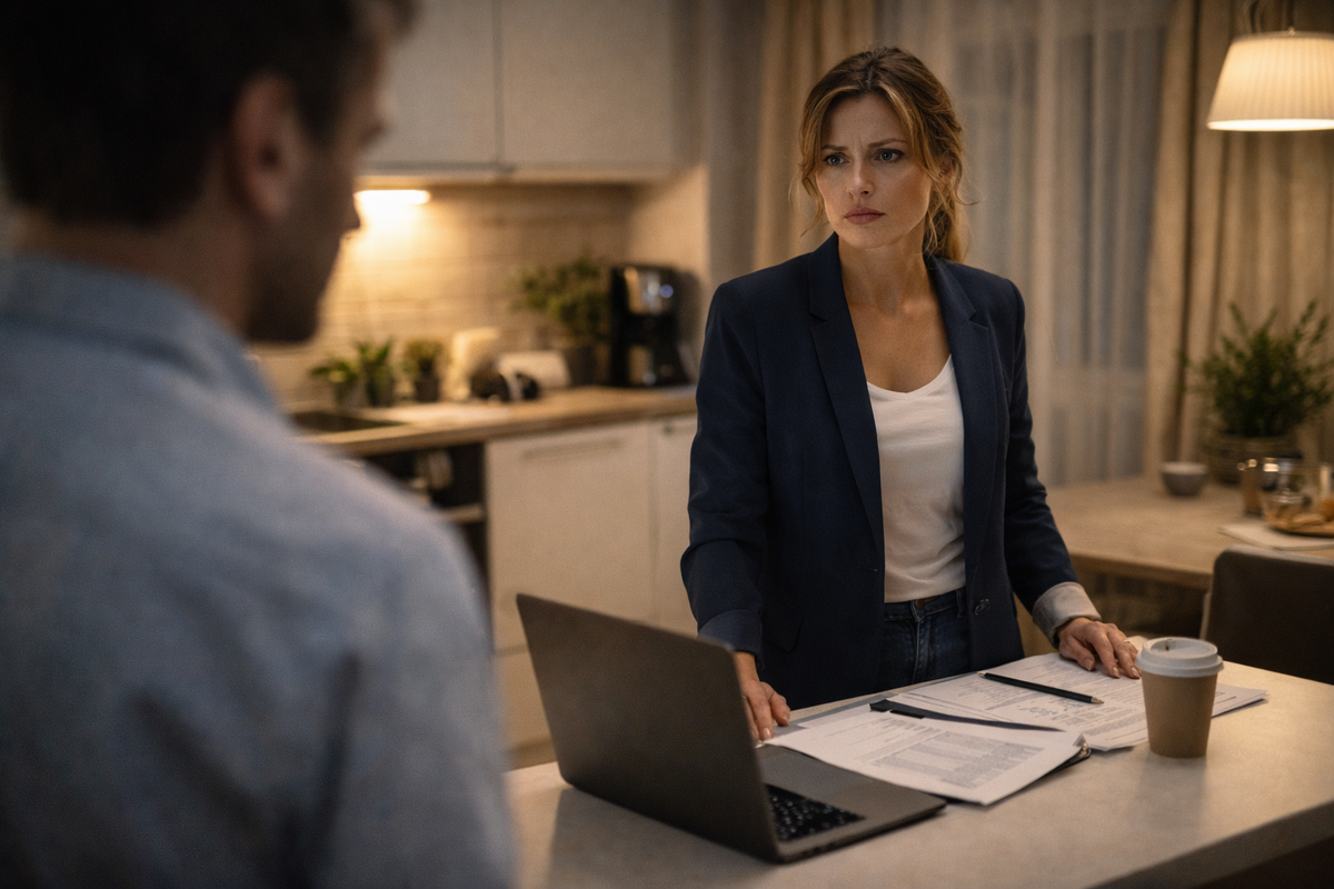 На кухне Оля стояла в строгом пиджаке, её волосы были аккуратно собраны. Она уверенно общалась по видеосвязи, за которой стоял ноутбук и расставленные документы.