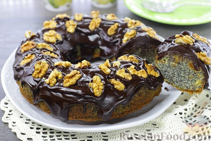 - Маковый кекс с орехами и изюмом – идеальный вариант для любителей сладостей. Этот кекс с насыщенной шоколадной глазурью и обильной начинкой из изюма и орехов станет гвоздем праздничного стола и оригинальным лакомством в любой день.