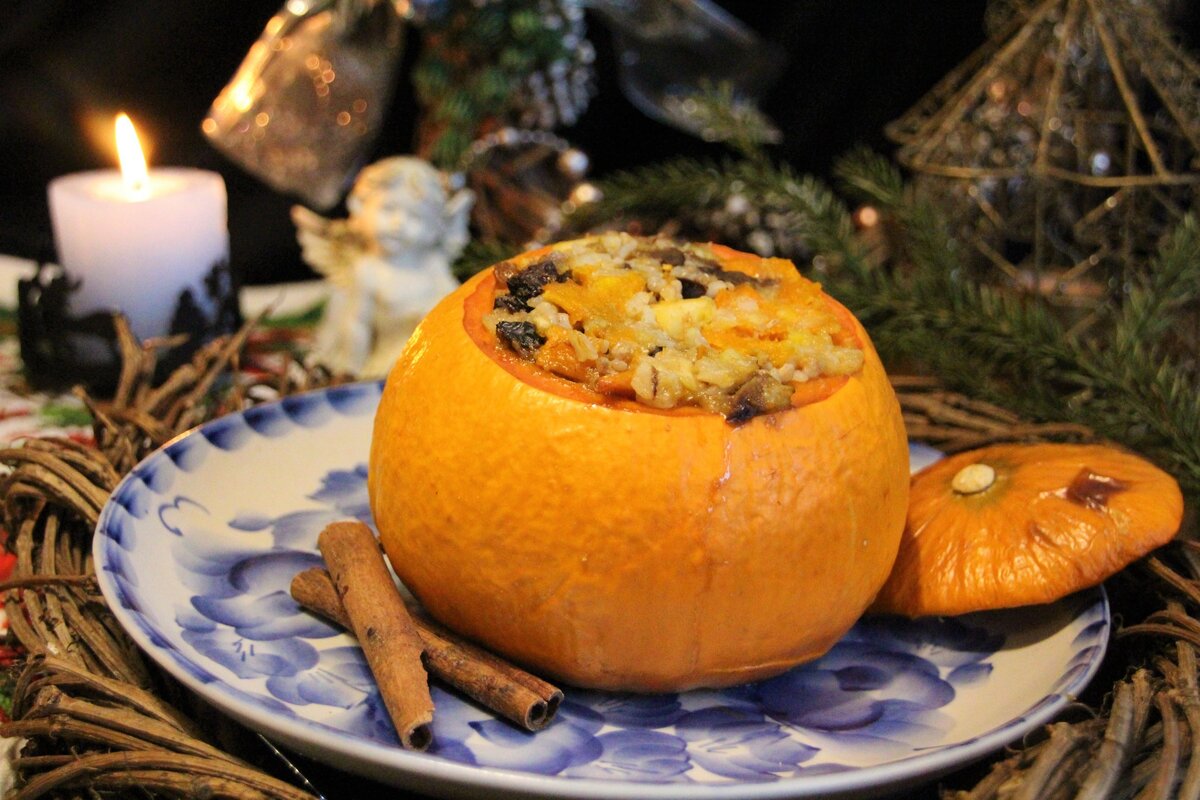 Предлагается современный вариант традиционного блюда: сочиво запеченное в тыкве с добавлением апельсинового сока и яблока, приправленное корицей. Это не только вкусно, но и выглядит очень празднично!