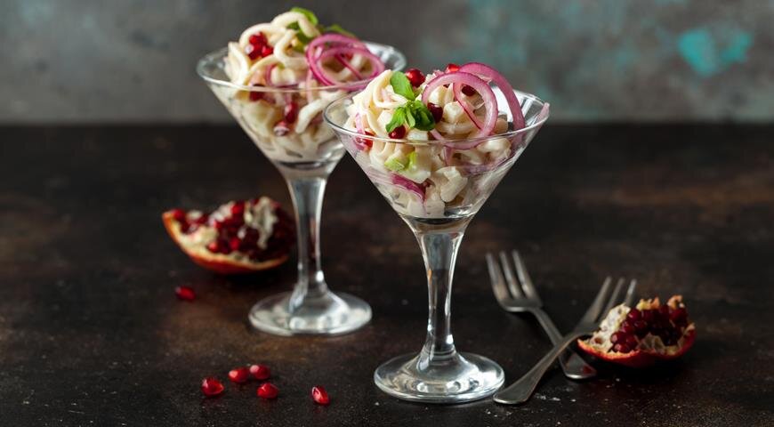 Подача салата из кальмаров в элегантных бокалах дарит этому блюду особый шарм, делая его отличным выбором для праздника. Чтобы избежать резкого вкуса, лук лучше предварительно ошпарить кипятком или выбрать сладкий красный вариант. Также можно обжарить его на сковороде с каплей растительного масла до зарумянивания.