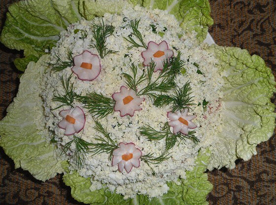 Начать приготовление с отделения листьев китайской капусты, которые послужат основой для салата — выложить их на дно салатницы.Далее нашинковать мелко несколько листиков другой капусты и белокочанную, добавить немного соли и перца по вкусу, затем заправить майонезом и аккуратно распределить по первому слою.Следующий слой — тертая на мелкой терке морковь с майонезом. За ней идет зеленое яблоко сорта Семеренко, также натертое на терке и дополненное майонезом. Далее укладываются тонкие дольки огурца с майонезом, затем редис, нарезанный кружочками, снова с майонезом. На очереди помидоры, нарезанные ломтиками, посыпанные мелко рубленой зеленью и заправленные майонезом. Завершает композицию сладкий перец, который нужно нарезать маленькими кубиками и также добавить майонез.В завершение украсить верх салата натертыми яйцами, добавив индивидуальные акценты по желанию. Не забудьте использовать майонез в каждом слое, чтобы получить насыщенный вкус!
