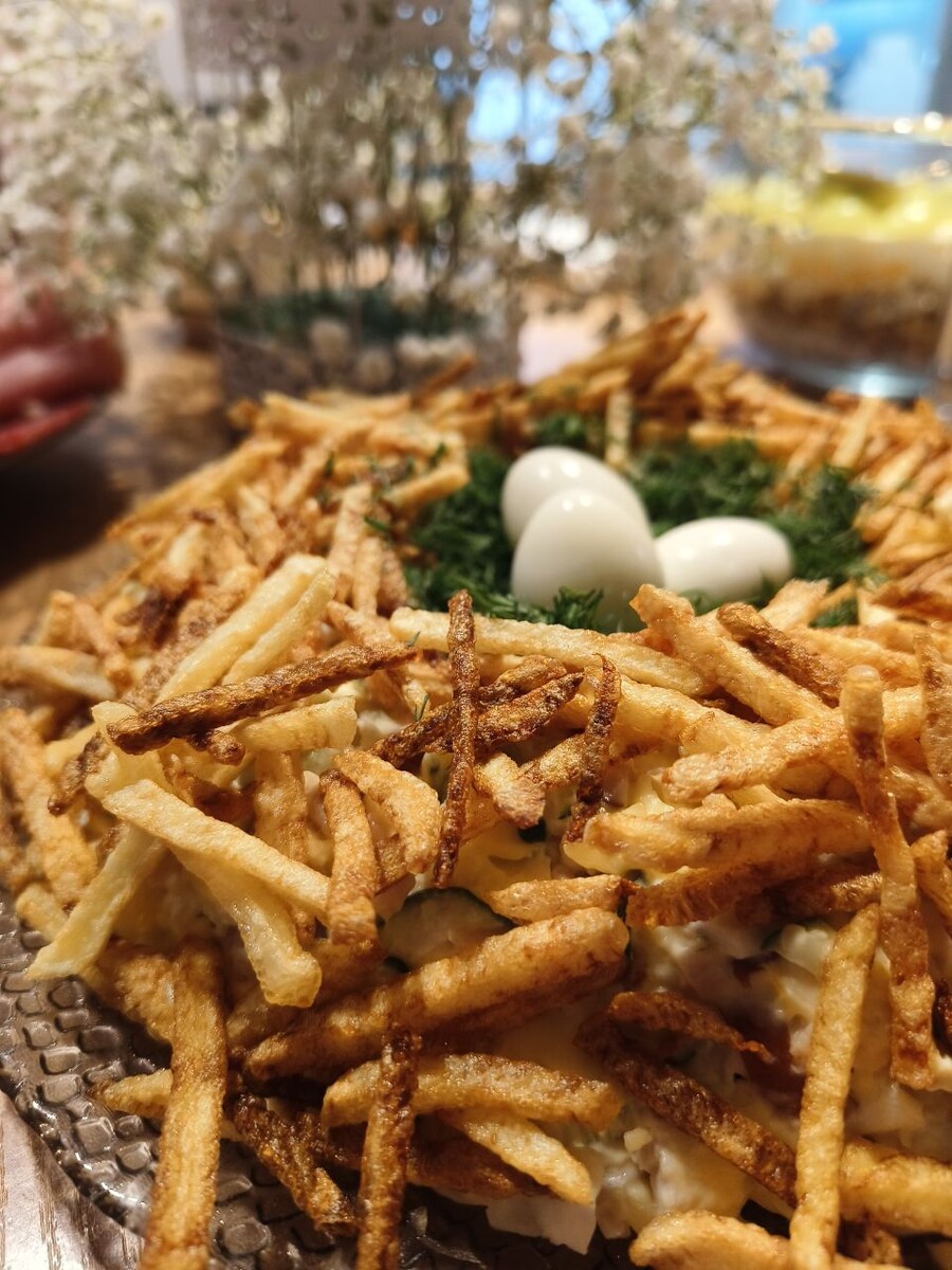 - Инновационная текстура: Хрустящие картофельные соломки заменили традиционный вареный картофель, придавая блюду современный акцент.