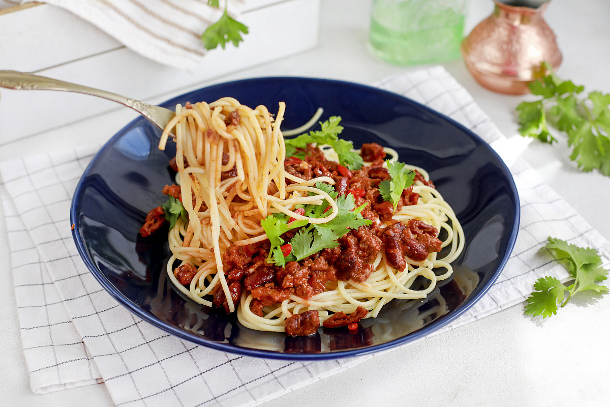 Шаг 3: Мелко нарезать кинзу и вяленые томаты. В конце приготовления добавить в сковороду фасоль, кинзу, вяленые томаты, соль и перец по вкусу. Хорошо перемешать. Подается спагетти с соусом сразу же, чтобы насладиться богатым вкусом.