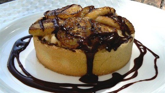 Просейте пшеничную муку в глубокую миску, затем натрите на крупной терке холодное сливочное масло. Добавьте сахарную пудру и хорошо перемешайте до состояния крошки. Вбейте желтки, замесите тесто и сформируйте из него шар. Упакуйте его в пленку и уберите в холодильник на минимум два часа.Раскатайте тесто в тонкий пласт, выложите его в форму для выпечки, предварительно смазанную и присыпанную мукой. Оставьте края теста свисать. Выпекайте при температуре 200 градусов 25-30 минут до золотистого цвета. Дайте тесту остыть и обрежьте края. Тем временем растопите шоколад с маслом в микроволновой печи и покройте тесто внутри слоем шоколада.В отдельной миске соедините сливки с маскарпоне и добавьте вареное сгущенное молоко. Перемешайте так, чтобы сохранилась текстура каждого ингредиента. Выложите получившуюся начинку в заранее подготовленное тесто и поставьте его в холодильник.Пока пирог охлаждается, нарежьте бананы и обжарьте их до золотистой корочки на сливочном масле. Дайте немного остыть и выложите их сверху на крем. Завершите творение, полив шоколадным соусом.Пирог готов! Он станет идеальным десертом для праздников и семейных встреч. Можно смело экспериментировать с оформлением и добавлять свои любимые ингредиенты!