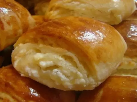 Когда тесто остыло, его нужно раскатать в прямоугольники толщиной примерно 3 мм. На тесто равномерно распределяется творожная начинка, после чего его необходимо скатать в рулет и нарезать на небольшие брусочки под углом. Эти заготовки выложите на противень, предварительно застеленный бумагой для выпечки. Для аппетитного цвета рулетики сверху стоит смазать желтком. Выпекать в духовке нужно при температуре 180 градусов в течение 30-35 минут, пока они не станут золотистыми.