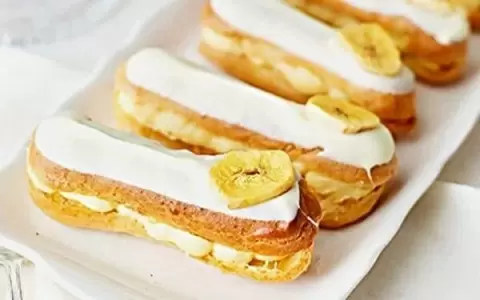 Выбрать банановые чипсы для украшения. Разрезать эклеры и наполнить их банановым кремом. Растопить белый шоколад и окунуть верхушки эклеров, добавить чипсы. Оставить в холодильнике, чтобы шоколад затвердел.
