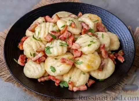 - Ингредиенты: картофель, яйца, пшеничная мука, бекон, соль, зелень петрушки.
